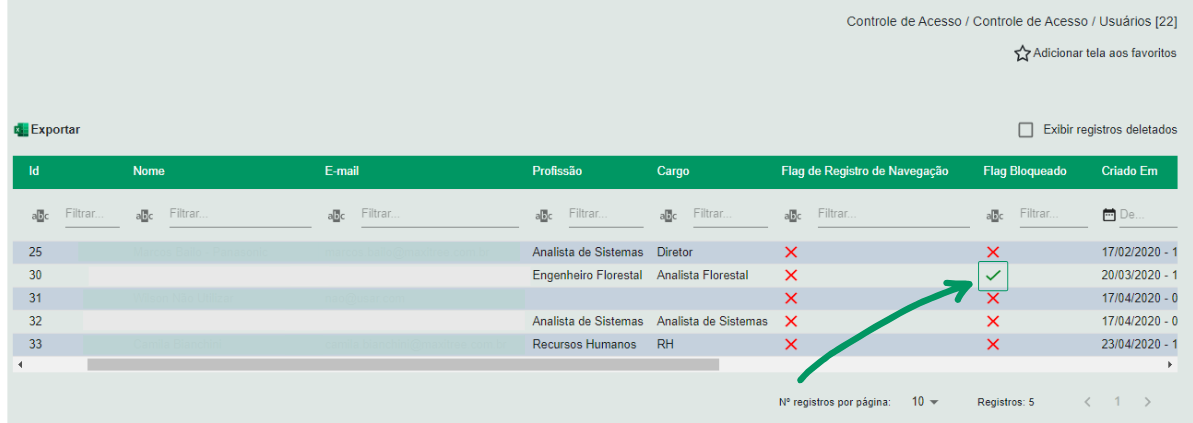 Este processo é bem simple, basta entrar na tela [Controle de Acesso / Controle de Acesso / Usuários] e acionar a Flag Bloqueado para o usuário que deseja bloquear. Veja a imagem abaixo: