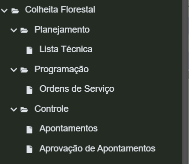 Nesta tela são realizados os apontamentos das operações de colheita. Nela, inicialmente, tem-se uma grid com as Ordens de Serviço existentes. Ao detalhar uma ordem de serviço será exibido um botão para iniciar um novo apontamento e uma grid contendo os apontamentos já realizados na ordem.