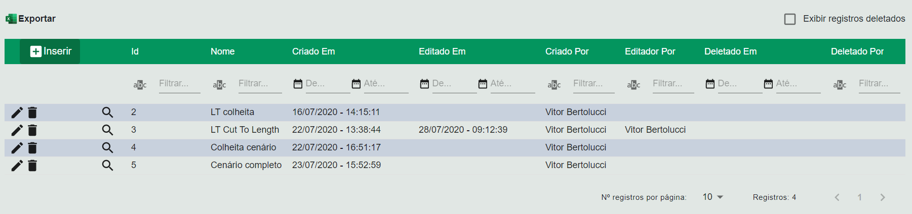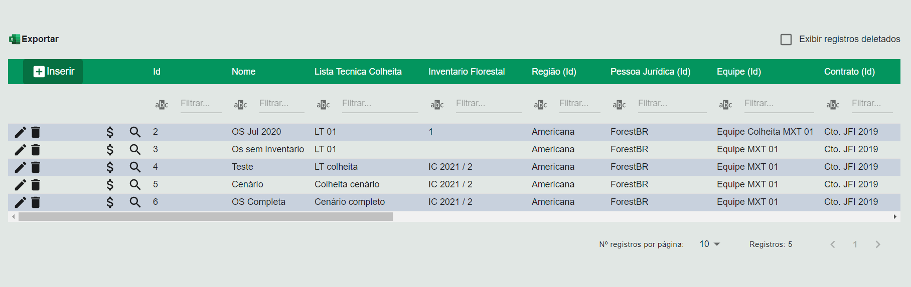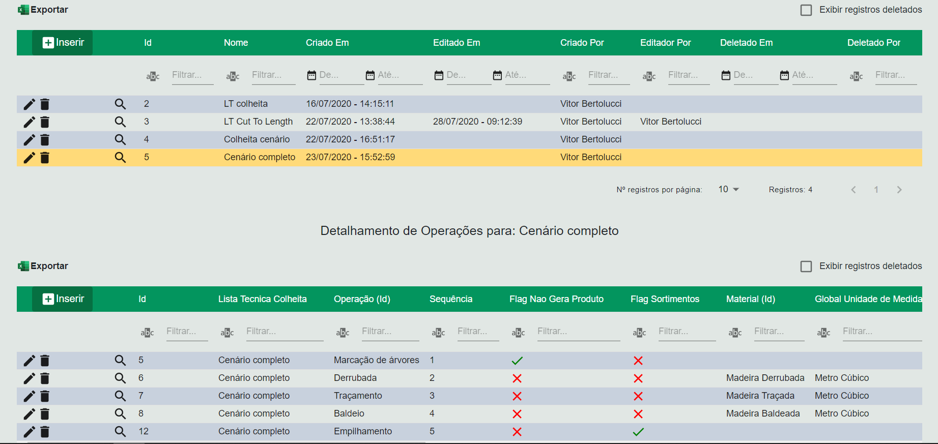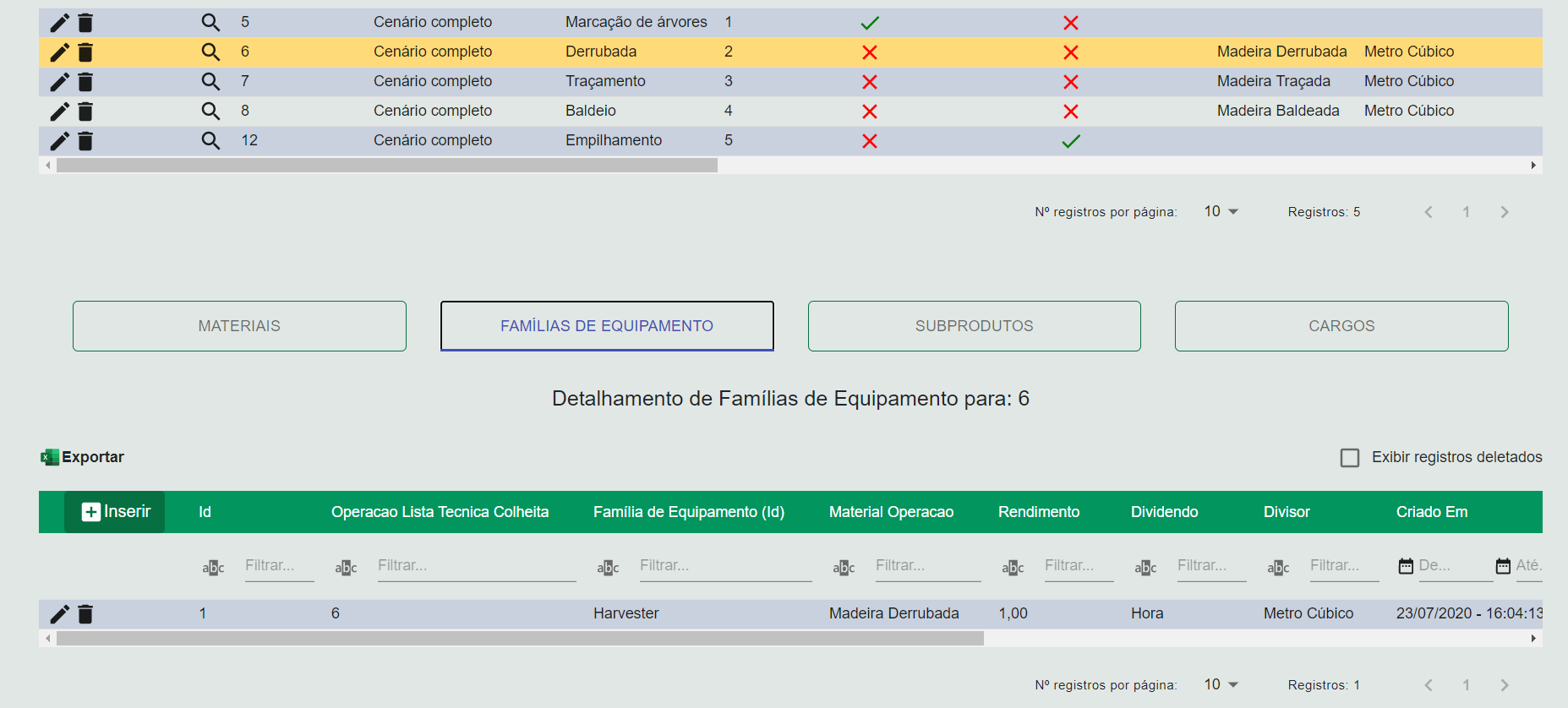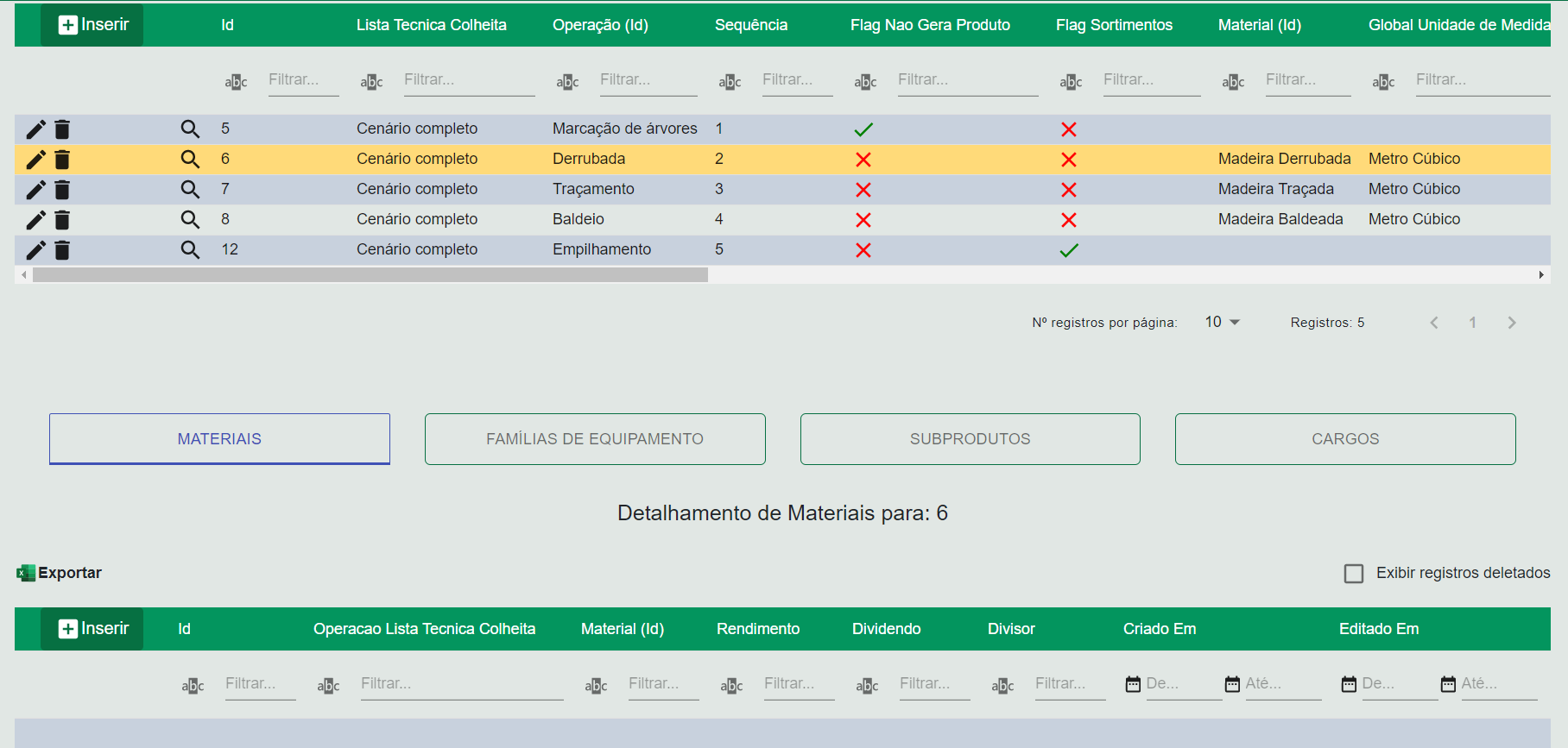 Nesta tela é feito o planejamento de operações a serem executadas em ordens de serviço. Dentro da lista técnica é possível configurar uma sequencia de operações a serem realizadas, bem como os materiais que ela consomem e produzem, os equipamentos que elas utilizam e a integração com os resultados do inventário florestal.