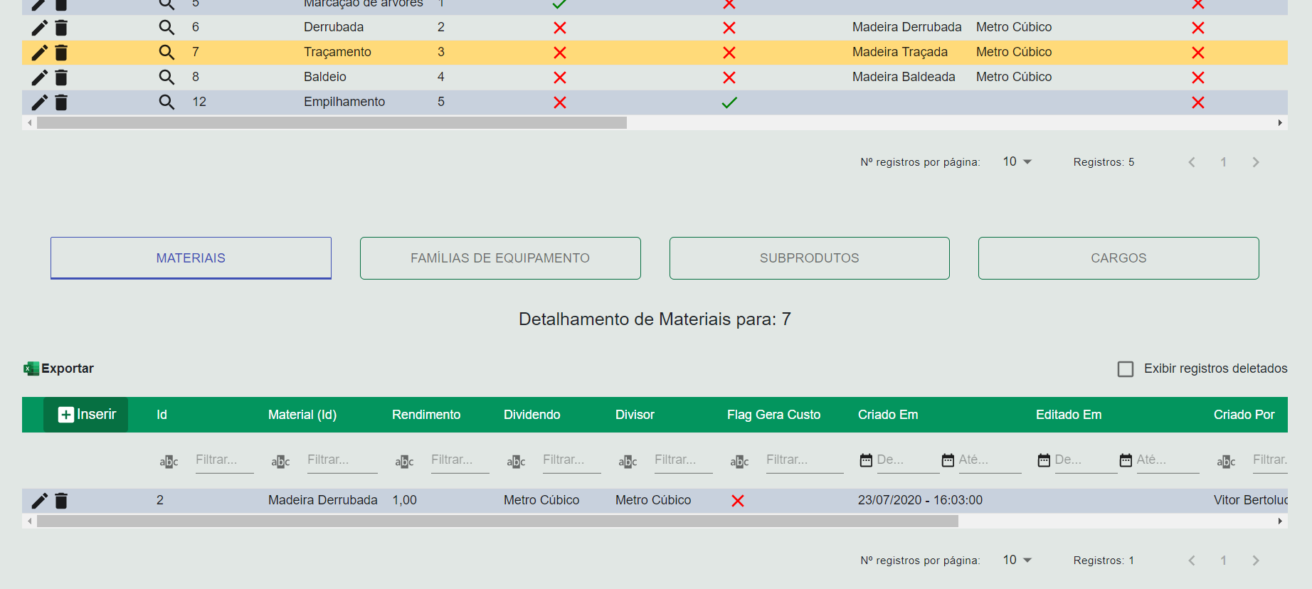 Nesta grid são cadastrados os materiais que poderão ser consumidos durante a execução da operação e estes estarão disponíveis para serem apontados nos apontamentos de colheita.