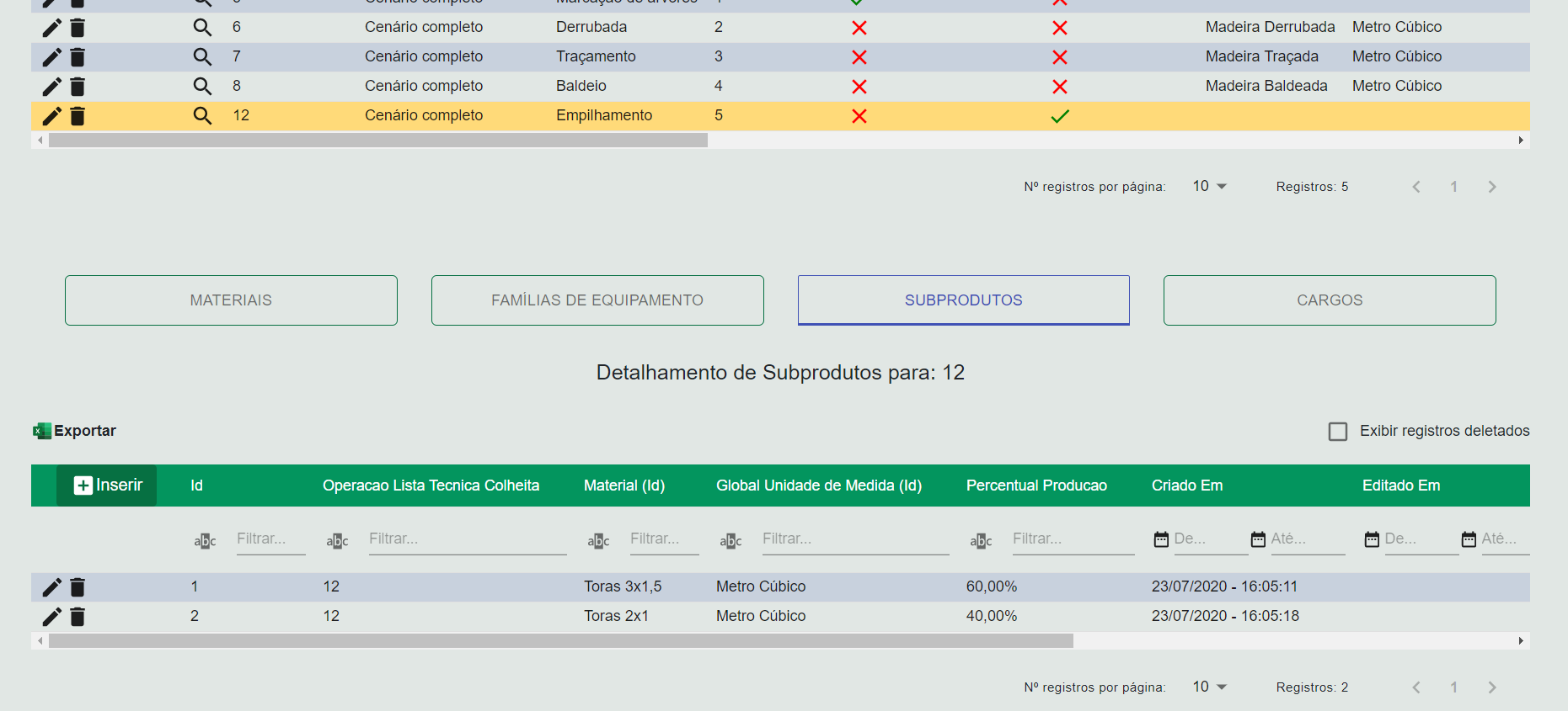 Nesta grid são cadastrados os subprodutos que poderão ser gerados na execução desta operação e estarão disponíveis para serem apontados no apontamento de colheita. Esta grid somente poderá ser preenchida caso a FlagSortimentos estiver acionada.