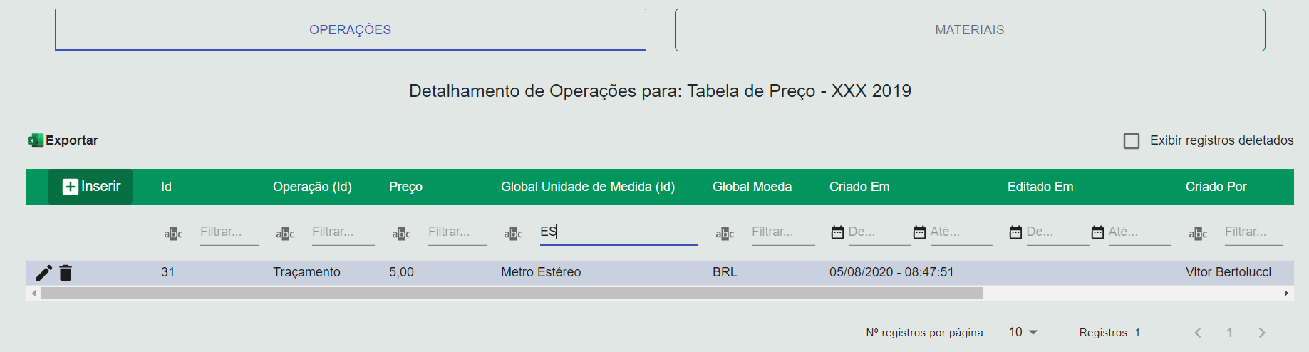 Cadastramos a operação Traçamento na Tabela de Preço com um preço de R$5,00 e unidade de medida Metro Estéreo.