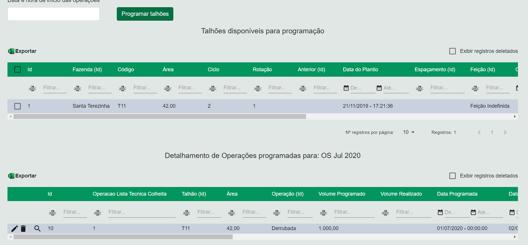 - Grid de talhões para o qual as operações poderão ser programadas;