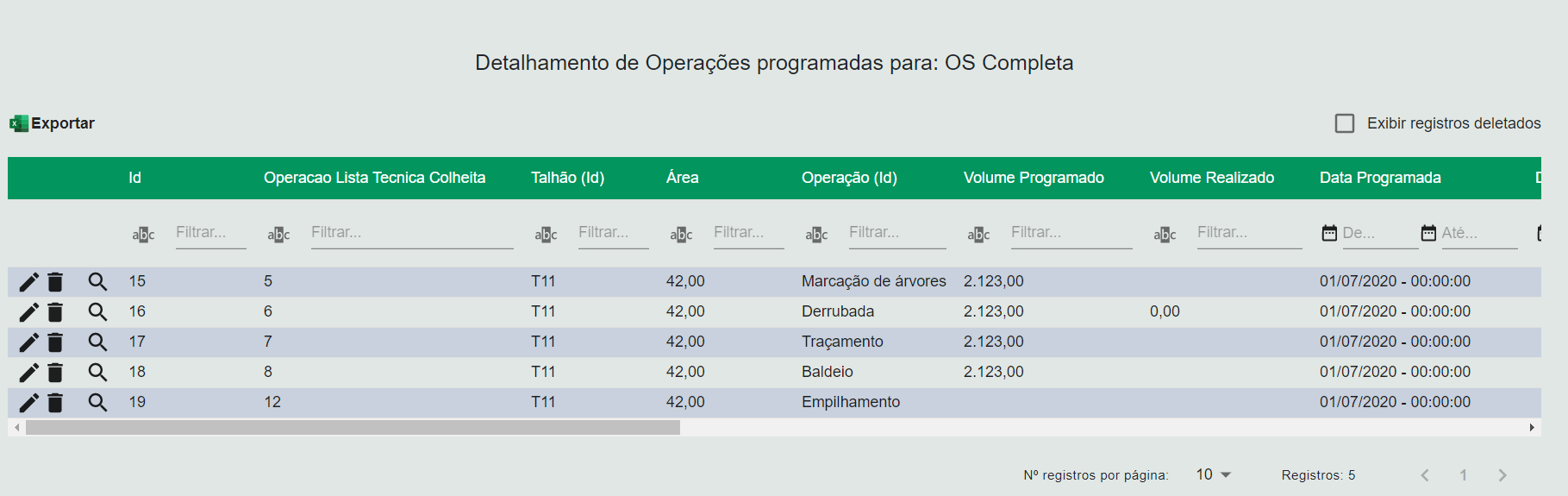 Volume Programado – Volume programado para ser obtido com a conclusão da operação, calculado a partir do Inventário Florestal definido para a ordem de serviço, preenchido automaticamente pelo sistema no momento da programação;