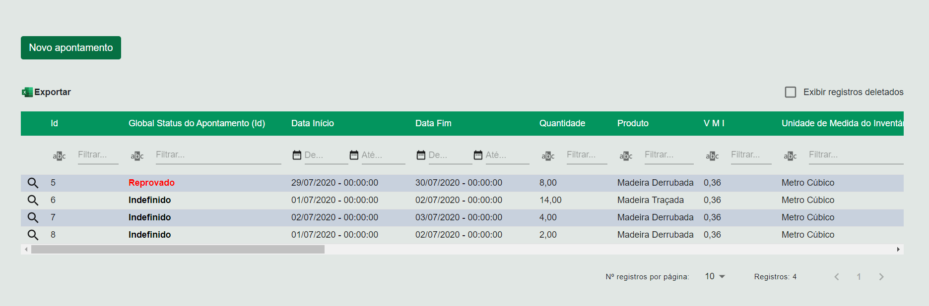 - Caso o status anterior do apontamento seja Aprovado, os materiais produto e subprodutos apontados sofrerão estorno, sendo deduzidos do estoque do depósito vinculado à fazenda na qual o talhão no qual a operação foi realizada está inserido.