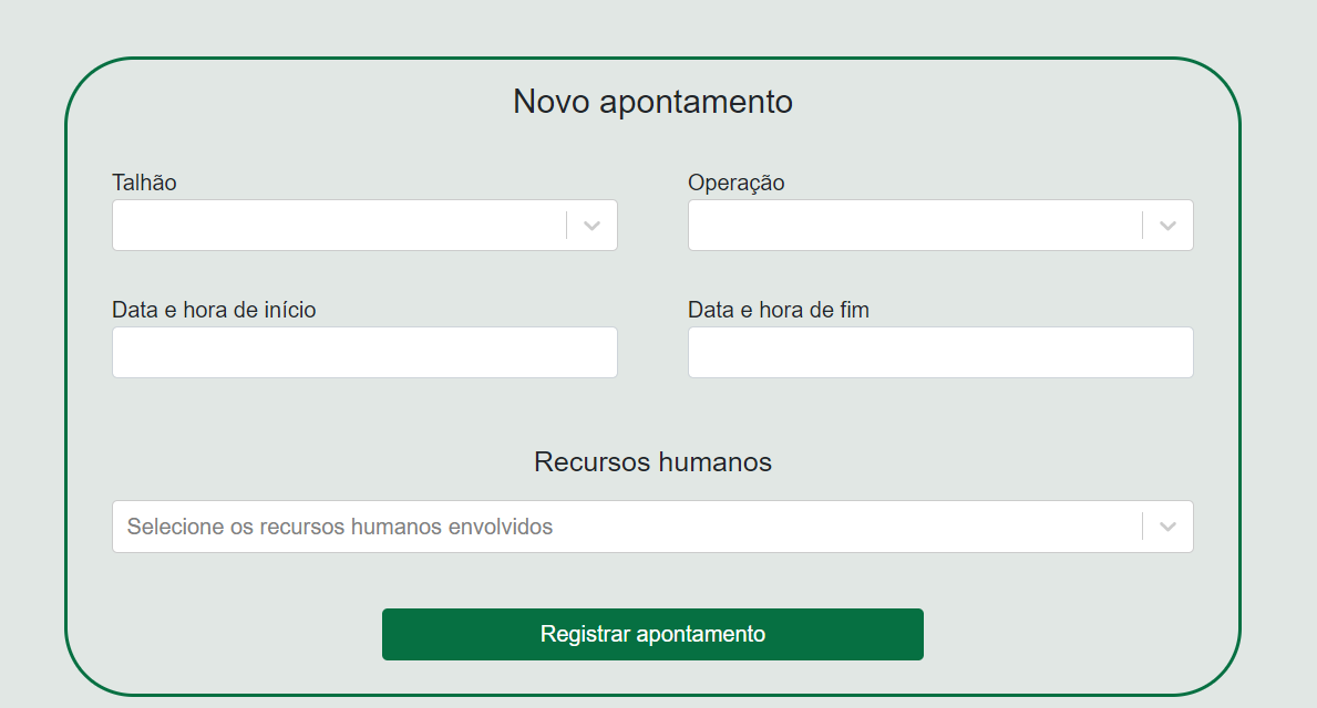 Novo apontamento Este botão é usado para iniciar um novo apontamento de colheita. Ao clicar nele, um formulário de apontamento em branco será exibido.