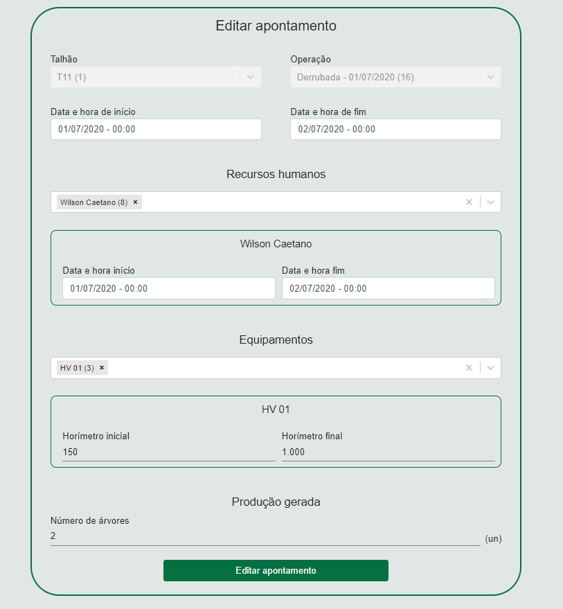 - Edição dos recursos humanos da Ordem de Serviço à qual o apontamento se refere, com alteração nas colunas Data Início e Data Fim;
