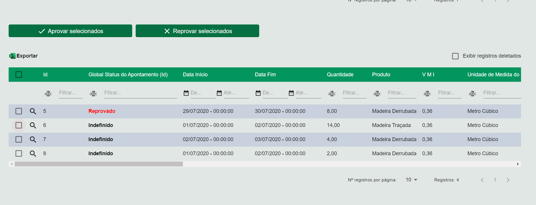Reprovar selecionados Antes de clicar neste botão, deve-se selecionar os apontamentos que se deseja reprovar. Somente apontamentos com status Indefinido ou Aprovado poderão ser reprovados. Quando um apontamento é reprovado, são realizadas as seguintes tarefas: